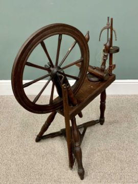 LATE 18TH CENTURY MIXED WOOD SPINNING WHEEL, 97cms overall H, 86cms W, 50cms max. D