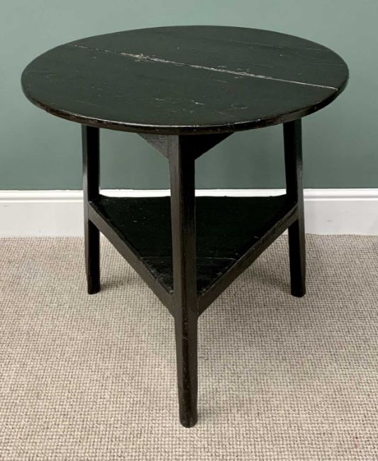 ANTIQUE STAINED & PAINTED PINE CRICKET TABLE, with lower conjoining shelf, 75cms H, 74cms top diam.