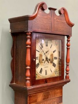 THEOPHILUS DAVIES, LLANRWST, VICTORIAN OAK & MAHOGANY LONGCASE CLOCK, 14-inch square dial, having gilt painted centre and spandrels, the dial set with Roman numerals, subsidiary seconds dial and date aperture before a twin weight pendulum driven bell strike movement, pendulum and weights included, the hood with broken swan neck pediment above a single glazed door flanked by turned pillars, crossbanded trunk door and half cut pillars on a stepped trunk base with corner bracket feet, 222cms H, 61cms W (GOV.UK self-declaration form completed for the sale of this item - Submission reference 86BKVUYT)