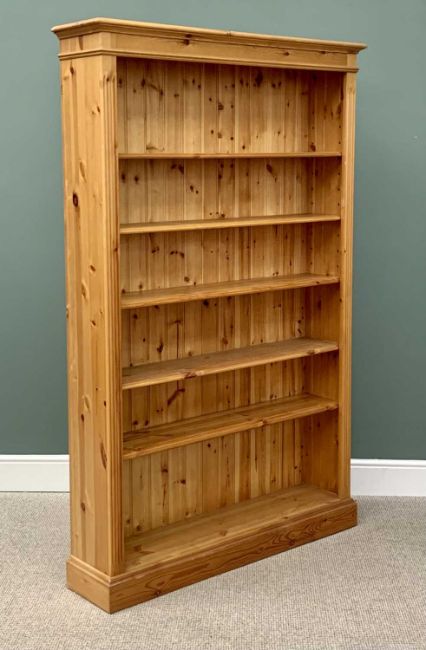 LARGE REPRODUCTION PINE BOOKCASE, with interior adjustable shelves, reeded front detail, on a plinth base, 198cms H, 124cms W, 29cms D