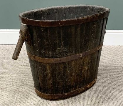 FRENCH IRON BANDED GRAPE HOD probably chestnut, initialled to the front 'RP', 53cms H, 62cms W (not incl. side carry handles), 43cms D