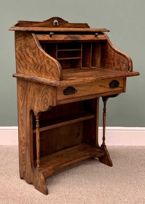 VINTAGE OAK ARTS & CRAFTS-STYLE TAMBOUR FRONT WRITING DESK, having a pierced top rail with shutter fall and pigeon hole interior, over a single frieze drawer with embossed Art Nouveau-type backplates and swing handles, over an open shelf base with turned decorative supports, 180cms H, 72cms W, 47cms max. D