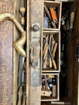 LARGE VINTAGE WOODWORKERS TOOL CHEST & CONTENTS, to include various drill braces and bits, chisels, hand saws ETC, the interior with fitted drawers, the lidded chest with iron side carry handles, 50cms H, 92cms W, 54cms D