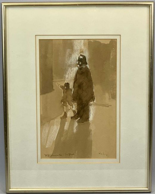 HAROLD RILEY mixed media - policeman and boy, titled 'The Policeman Salford', signed lower right, 33 x 20cms
