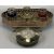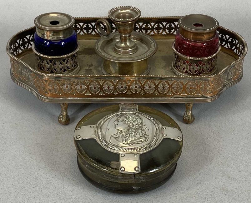 GEORGIAN HORN & WHITE METAL MOUNTED SNUFF BOX & A 19TH CENTURY DESK STAND, the circular snuff box mounted to the top with unmarked white metal, having a profile embossed image of possibly George III, 3.5cms H, 9.25cms diam., the desk stand in shaped rectangular format with pierced gallery on four ball and claw feet, having cranberry red and blue glass ink bottles and central candleholder, 9cms max. H, 24.5cms across, 12.cms D