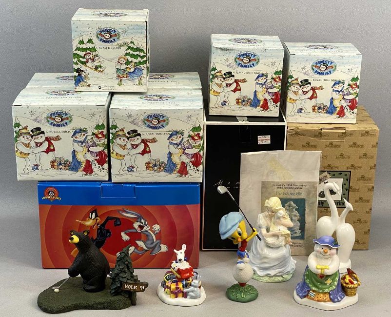 BOXED COALPORT 'LOONEY TOONS' FIGURE 'SHOOT A BIRDIE', boxed Coalport figurine, Moments Togetherness, a boxed limited edition (0701/9018) resin figure 'Duffy' Bearfoots Bears by Montana artist Jeff Flemming, 7 x boxed Royal Doulton Frosty Family figures and a Coalport limited edition (1610/9400) figurine 'The Goose Girl' with certificate