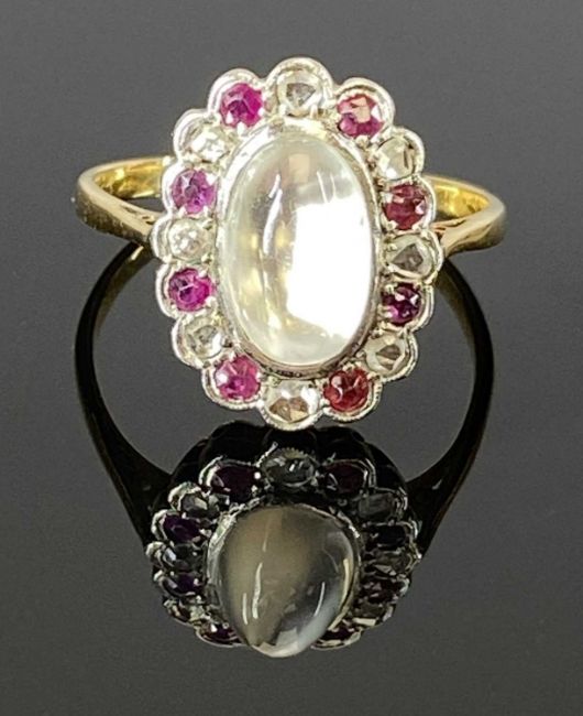 18CT YELLOW & WHITE GOLD MOONSTONE, DIAMOND & RUBY OVAL CLUSTER RING, the oval moonstone 10 x 6mm estimated, centrally mounted with a surround of 8 old European cut diamonds 0.32ct estimated value, and 8 round faceted rubies, 0.40ct estimated value with an openwork back, stamped '18K', size P, 4.3g, with copy of insurance appraisal