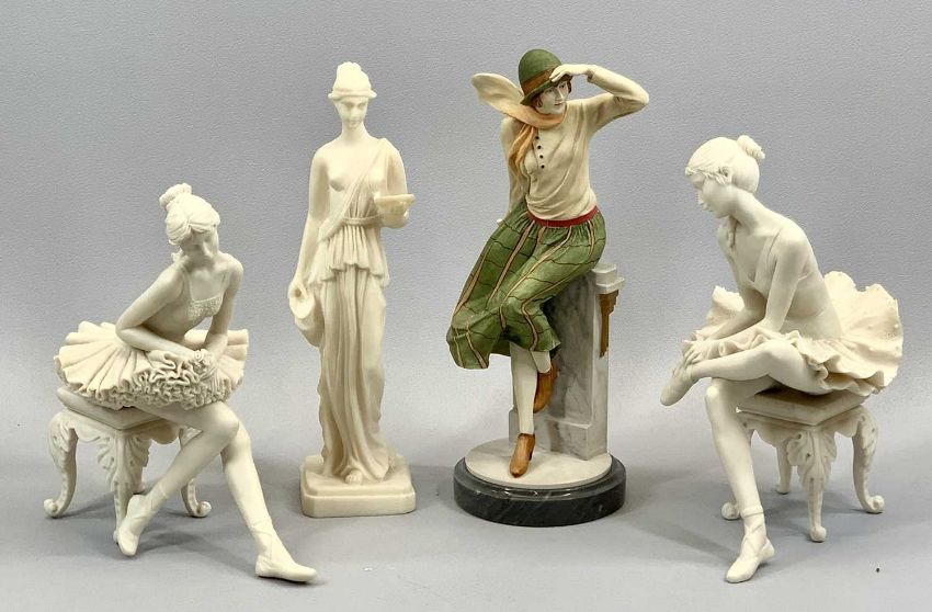 FRANCESCA ART CHINA STAFFORDSHIRE x 19 FIGURINES, Royal Doulton 'Classique' figurine 'Lucinda CL3983', Royal Worcester figurine 'Polly Put the Kettle On 3303', composite figures of seated ballerina, a pair, and one other composite figure