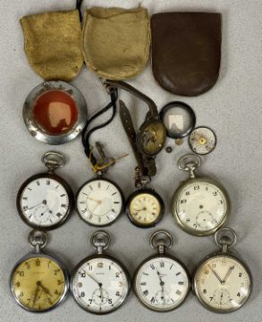 EIGHT VARIOUS POCKET / FOB WATCHES, VINTAGE WRISTWATCH- lot includes 3 x military issue base metal pocket watches with broad arrow markings, all have Arabic numerals to the dials and subsidiary seconds dials, 2 x appear working when listed, the first unnamed numbered to the back 6E/50 BT095, 52cms cased diam., 1 x marked Cyma, marked to the back GS/TP 066387, 52mm case diam., the other marked Leonidas, marked GSTP T38424 XX, 52mm case diam., silver cased key wind pocket watch, Chester date stamp 1895, the white dial set with Roman numerals, the movement numbered 15219, with winding key, not currently running, 42mm case diam., a further believed silver cased pocket watch, the dial marked pilot, set with Roman numerals and subsidiary seconds dial, appears working when listed, closed case, no access to the movement, 50mm case diam., 2 x further base metal pocket watches and a lady's gun metal fob watch with gilt mounts, the dial set with Roman numerals in red with gilt decoration, 33mm case diam. Vintage wristwatch for spares or repair, metal pocket watch outer case etc