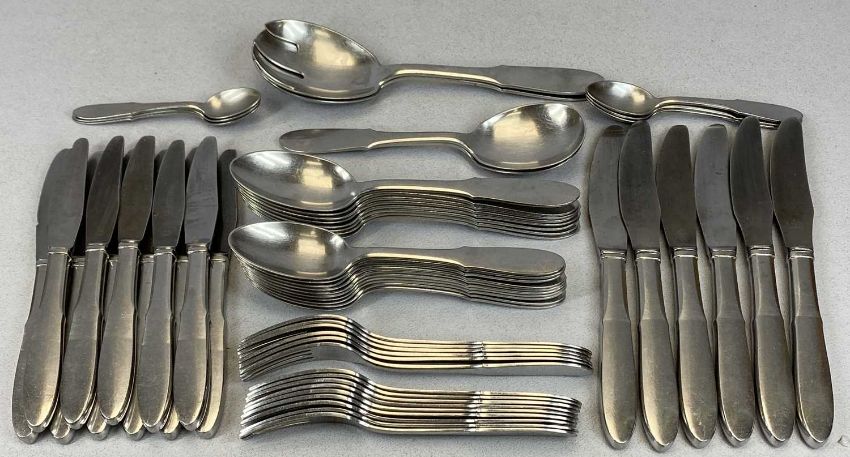 GEORG JENSEN DENMARK STAINLESS STEEL MITRA PATTERN CUTLERY, 61 PIECES, comprising 9 x 17.5cms L forks, 6 x 18.5cms L forks, 6 x 23cms L knives, 11 x 20cms L knives, pair of salad servers, one mustard spoon, 3 x 13cms L teaspoons, 3 x 11.5cms L coffee spoons, 2 x 18cms L soup spoons, 10 x 17.5cms L pudding spoons and 8 x 19cms L tablespoons