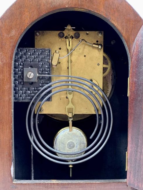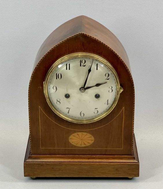 EDWARDIAN INLAID MAHOGANY MANTEL CLOCK with arched top, silvered dial with Arabic numerals, 8-day movement striking on a gong, 32cms H