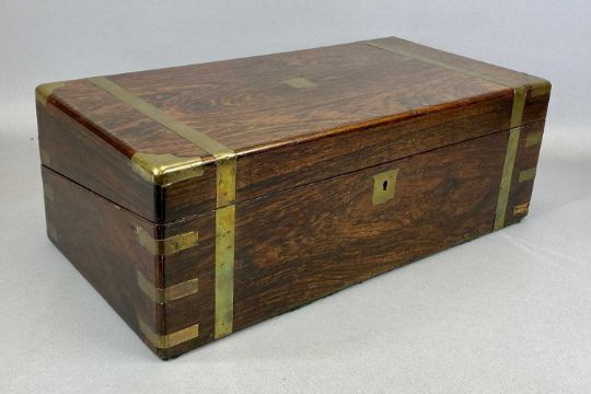 VICTORIAN BRASS BOUND ROSEWOOD WRITING BOX, the hinged lid enclosing interior with compartments and tooled red leather writing surface, 17.5cms H, 50cms W, 26cms D