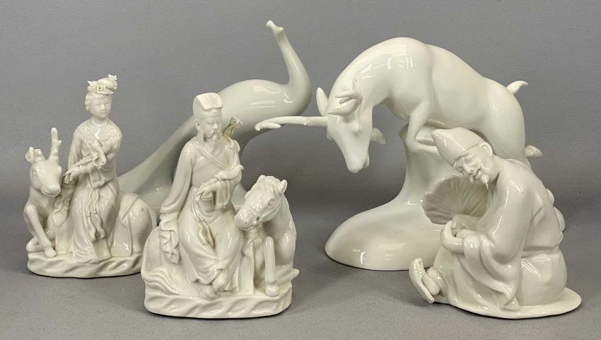 ROYAL DOULTON CLASSICS 'IMAGES OF NATURE' FIGURINE 'MAJESTIC HN4177', 18cms H, Royal Dux white glazed peacock figure, pink triangle mark to base, 18cms H, and 3 x Chinese blanc-de-chine figurines, 15cms (the tallest)