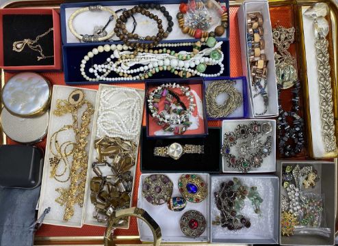 VINTAGE & LATER COSTUME JEWELLERY, including some marked silver, other items include gold tone, diamante, enamel and various coloured stones ETC, as displayed on 3 trays