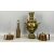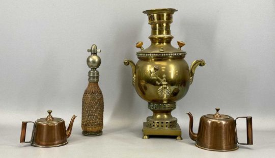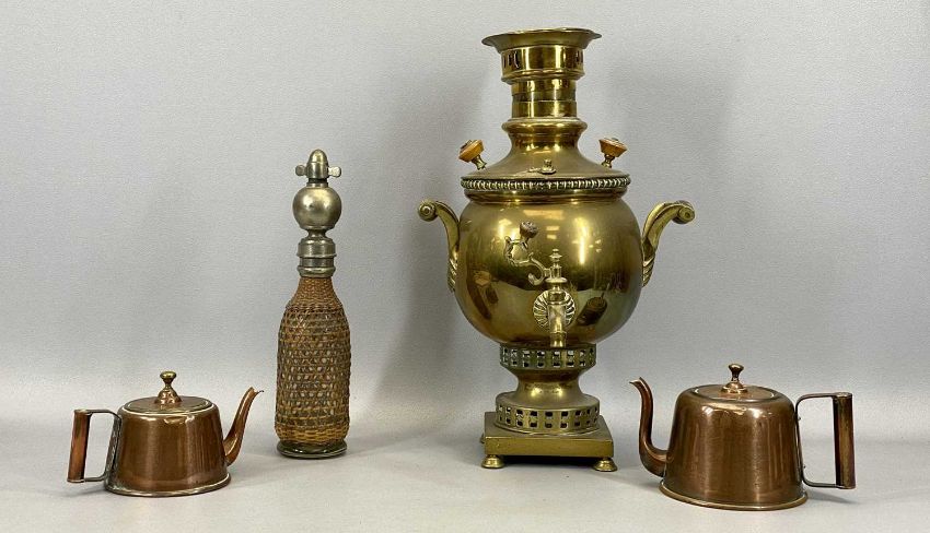 RUSSIAN BRASS SAMOVAR WITH TURNED WOOD SIDE HANDLES, standing on square base, 45cms H, an Aerators cane bound glass soda siphon with plated fitting, 32cms H, an Argyle circular copper coffee pot, registration no. 150094, 13cms H, and another Argyle coffee pot, 11cms H
