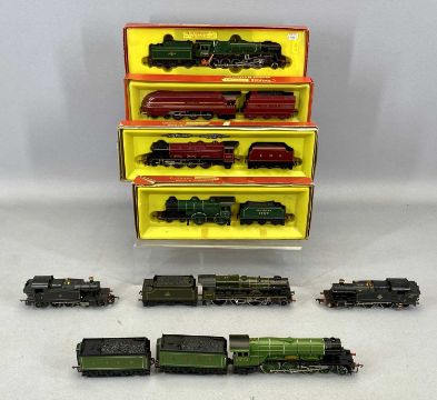 BOXED TRIANG HORNBY DUBLO LOCOMOTIVES & TENDERS x 5, R.861 B.R.2-10-0 locomotive Evening Star, R.350 S.R.4-4-0 L.I locomotive, R.871 L.M.S.4-6-2 coronation locomotive - maroon, R.258 L.N.S4-6-2 loco Princess Elizabeth, 4472 LNER Flying Scotsman with two tenders (without box), boxed Airfix railway system Dublo locomotive Prairie tank locomotive 2-6-2 (BR black livery), 46100 Royal Scot (without box) and Lima models 5574 locomotive (boxed)