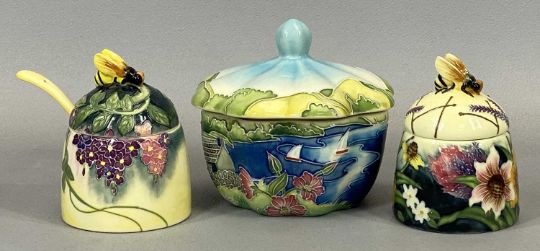 OLD TUPTON WARE FLORAL DECORATED HONEY POTS x 2, the covers with bee finials, both boxed, one with matching spoon, and an Old Tupton ware shaped circular lidded pot, 11cms H, together with a handpainted ceramic parrot figure, 24cms H