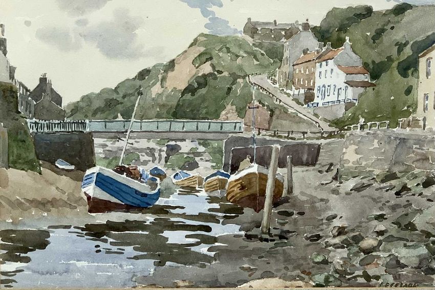 E L CLARK (British, 20th Century) watercolour - harbour at low tide with buildings to side, signed lower right, 33.5 x 50.5cms