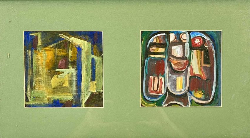 PAULINE SALMON (British, 20th Century) acrylic oils on board, a pair - abstract, 37.5 x 34.5cms, and a group of four acrylic oils titled verso 'Memories of India', each 15 x 16cms, contained within two frames