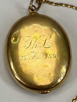 VICTORIAN & LATER JEWELLERY GROUP to include a cultured pearl and possibly a white gold floral spray brooch, stamped 'WGK14' in a Tasaki Pearls box, brooch 4.5cms across, 5.3g, Victorian locket on a filed curb link necklace in 14k gold, the locket unmarked and untested, yellow and rose gold colour, having leaf scroll embossed front decoration and inscribed to the back 'Th L 23 Feb 1880', 3.5 x 2.75cms (not incl. jump ring) the locket, 23cms overall length, 2.3g the 14ct chain, 14.1g gross, Victorian unmarked and untested yellow metal brooch with cabochon hardstone inset, 2.5cms across, 9ct gold opening pendant in the form of a walnut shell, 1.5cms (incl. jump ring), 0.8g and a Queen Mary Needlework Guild metal and enamel badge, 4.5cms overall length
