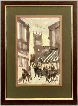 HAROLD RILEY DL DLITT FRCS DFA ATC (1934-2023) colour print - street scene with figures, and with dedication 'For Tony', 23.5 x 15cms