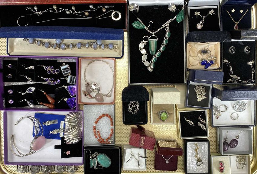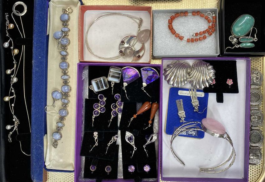 GOOD COLLECTION OF MAINLY HALLMARKED & 925 STAMPED SILVER JEWELLERY, many items set with hard and semi-precious stones, to include a mixed set of necklace, bracelet and 2 x pairs of earrings in malachite, nice agate set bracelet and earrings, Celtic-style pendant necklace with opal, diamante set dragonfly earrings, circular ring pendant necklace stamped 'T&Co', hallmarked silver Celtic-style brooch, silver gilt pendant necklace stamped '925 GPS DIA', the pendant with a central ruby, unmarked Egyptian-style white metal bracelet, 925 stamped lapis lazuli pendant necklace and pair of earrings, approx. 18 x other pairs of various earrings, some having matching pendant necklaces or bracelets, paste set rings, pink stone bangle ETC