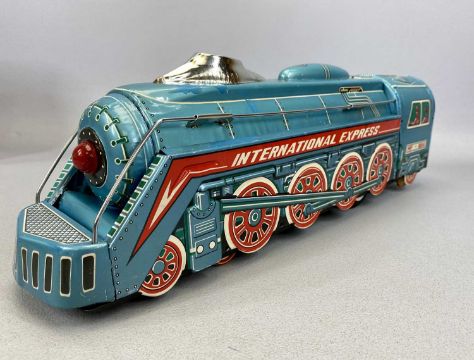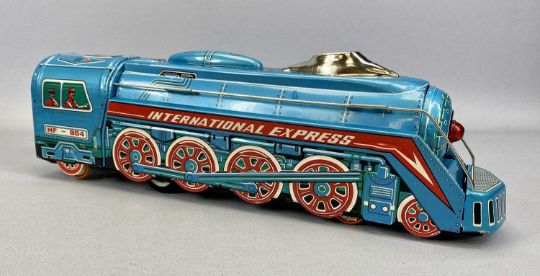 CHINESE MF804 FRICTION DRIVE TINPLATE INTERNATIONAL EXPRESS LOCOMOTIVES x 2, a Shri Ganesha tinplate international coach and a Lemezaru Gyar tinplate bump action operated model of a holdraketa spacerocket, all in original boxes