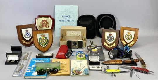 OUTDOOR / NAVIGATION SILVA COMPASS & TWO OTHERS, Captain Fields pattern parallel rule, brass and steel dividers, 2 x swiss army knives, locking knife, navigation manuals, archers fletching jig with various ambulance related plaques and other accessories including cufflinks and sunglasses ETC