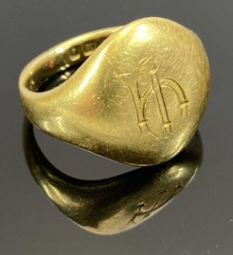 18CT GOLD MONOGRAMMED SIGNET RING, LONDON 1913, maker Goldsmiths & Silversmiths Co. Ltd, size K, 10.3g