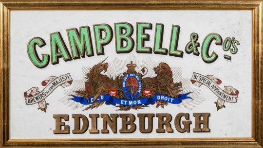 THE BEER CLUB HOUSE: VICTORIAN ADVERTISING SIGN CAMPBELL & CO., EDINBURGH, 'Brewers to Her Majesty by Special Appointment', colourful and heavily gilded, 34.5 x 65cmsProvenance: private collection Gwynedd Condition Report:printed on paper