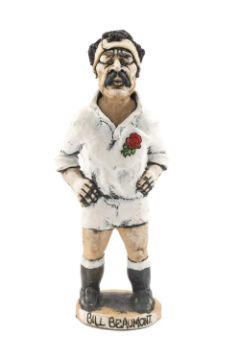 THE RUGBY CLUB HOUSE: GROGG CARICATURE BY JOHN HUGHES OF BILL BEAUMONT (Sir William Blackledge Beaumont) standing on titled base, wearing his England No.4 kit, ink signed 'John Hughes' to underbase, 26cms highProvenance: private collection Vale of Glamorgan