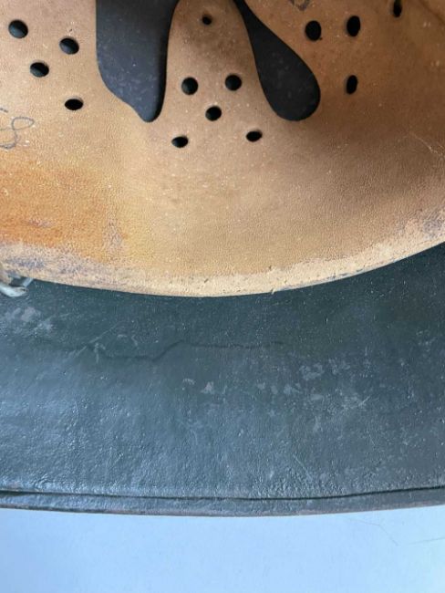 THE MILITARY CLUB HOUSE: WORLD WAR II GERMAN HELMET size 58 as per leather interior, leather chin-strap, green painted outerProvenance: private collection Denbighshire Condition Report:There is a 58 stamped on the outside of the leather, then on the inside is stamped 58N44. There is also an S stamped right in the inside centre on the metal