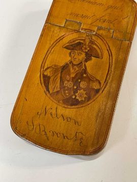 THE MILITARY CLUB HOUSE: NELSON SOUVENIR SNUFF BOX, satinwood, painted with oval portrait of Nelson between legends 'Palmam qui meruit ferat' and facsimile signature, the sides and base vermicelli-decorated, rinned interior, 10.5 x 5.5cmsProvenance: deceased estate Pembrokeshire