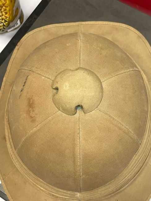 THE MILITARY CLUB HOUSE: WORLD WAR I ROYAL WELCH FUSILIERS PITH HELMET in khaki canvas and fine cotton ribbon, handwritten inscription includes '266876 E Davies R W Fus. Egypt, Palestine, April 1916 - August 1919'Provenance: private collection Denbighshire