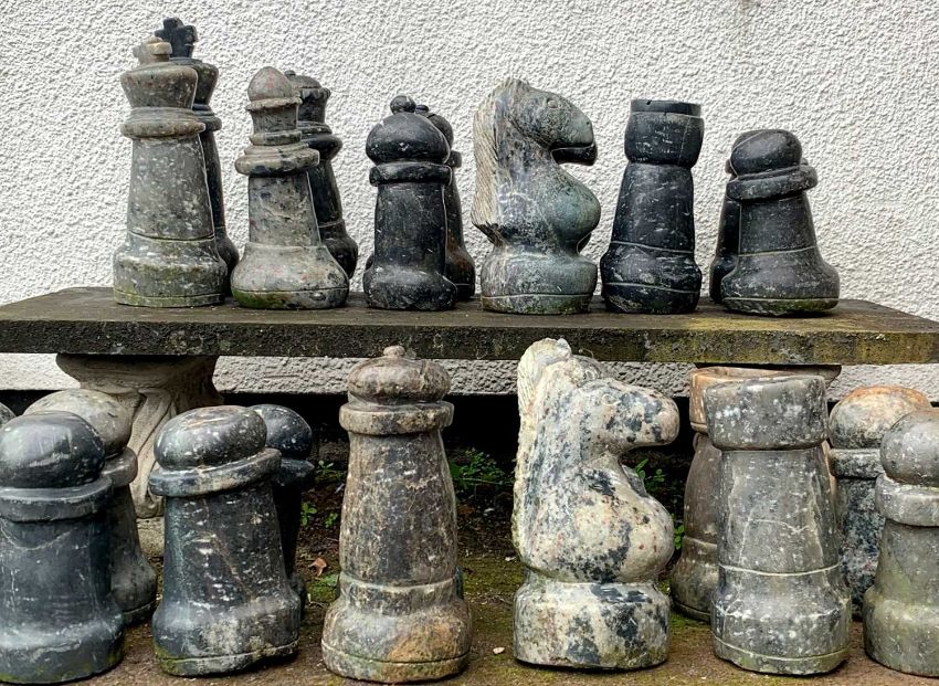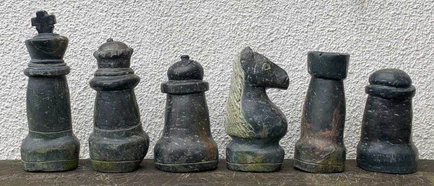 THE CHESS CLUB HOUSE: STONE GARDEN SET, Staunton pattern style, carved from solid stone, possibly Preseli, pawn 32cms h, 11.96kg, king 51cms h, 14.98kg, (32)Provenance: private collection SwanseaComments: damage to white king crown, black pawn repaired crack amongst others, white queen crown missing. All weather worn, consumate with age, viewing advised