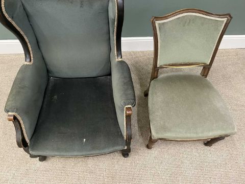 PLUS LOT 40 - TWO VINTAGE CHAIRS IN GREEN DRALON UPHOLSTERY, lot comprising a late 19th Century wingback armchair, having a carved crest rail, shaped reeded front detail on Queen Anne supports, 97cms H, 69cms W, 54cms seat D, the other being an open salon chair on turned and reeded front supports with metal castors, 78cms H, 51cms W, 49cms seat D