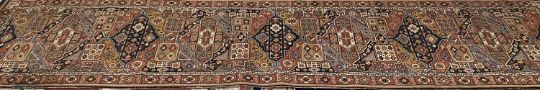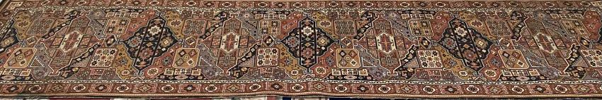 EASTERN STYLE WOOLLEN CARPET RUNNER, multicoloured repeating pattern central block, with block patterned full outer border, 363 x 89cms
