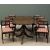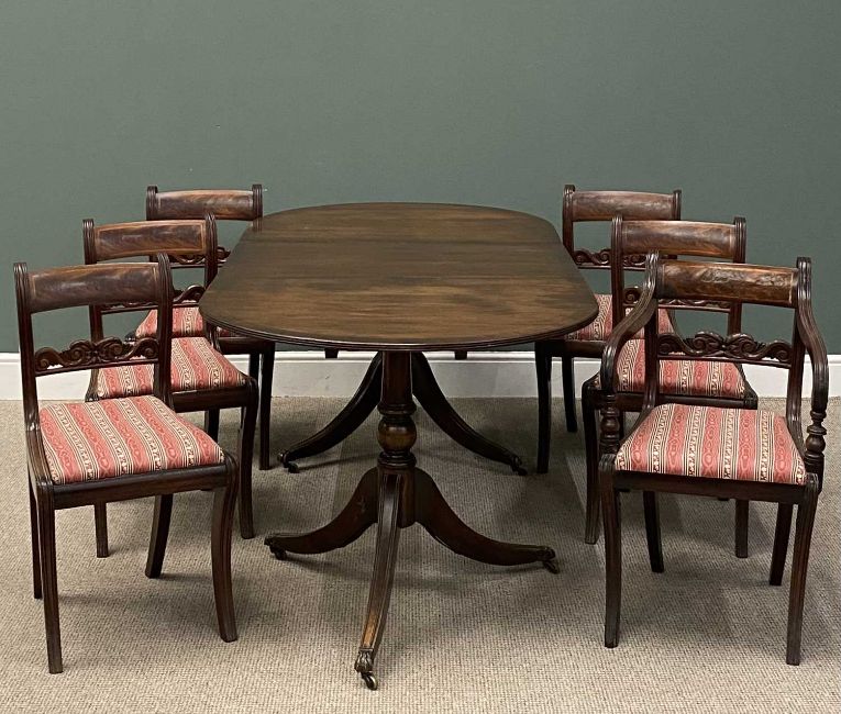 REGENCY MAHOGANY TWIN PEDESTAL DINING TABLE & SIX (5+1) DINING CHAIRS, the crossbanded top having an additional leaf with tilt pedestal columns on reeded splayed supports and brass lion paw and cup castors, 75cms H, 206cms approx. overall L, leaf in 96cms W, the chairs having crossbanded semi-curved crest rails, carved central back rails and reeded upright and arm details on sabre front legs, with upholstered drop in seats, 83cms H, 48cms W, 42cms seat depth (the carver)