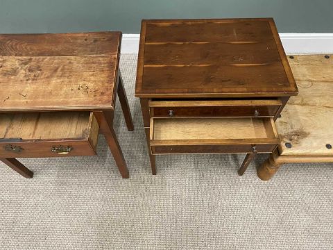 VINTAGE & MODERN FURNITURE PARCEL comprising a vintage mahogany single drawer hall table with later swing handle brassware on square supports, 70cms H, 71cms W, 43cms D, reproduction walnut two-drawer hall table with crossbanded top and drawer fronts on square tapering supports, 75cms H, 51cms W, 40cms D, and a modern Mexican-style coffee table, with ironwork decoration, 42cms H, 60 x 60cms square top