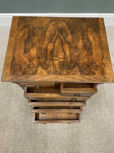 NEATLY PROPORTIONED REPRODUCTION WALNUT CHEST ON CHEST having canted upper corners flanking two small and three long drawers over a further two short and one long drawer, on corner bracket feet, 77cms H, 42cms W, 30cms D