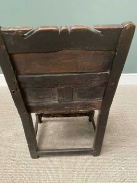 18TH CENTURY CARVED OAK ELBOW CHAIR, peg joined construction with chip carving to the back, panels and front, turned arm and front supports with bar stretchers, 91cms H, 50cms W, 33cms seat D
