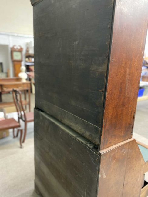 GEORGIAN PERIOD OAK BUREAU BOOKCASEcirca 1800, having a broken architectural pediment over twin glazed doors and interior adjustable shelves, the lower sloped fall opening to reveal a shelved interior with drop down well over a single blind drawer and a further two short and two long oak lined drawers, all having later replacement fancy brass backplates and swan neck handles, on corner bracket feet, 226cms overall H, 104cms W, 56cms max. D