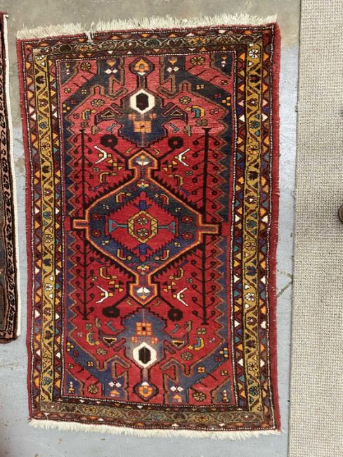 IRANIAN WOOLLEN RUG, red ground with repeating central block motif and multi-coloured triple border edging with tasselled ends, 160 x 100cms