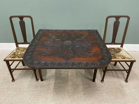 VINTAGE FURNITURE PARCEL comprising a carved top mahogany and oak single flap dining table, 72cms H, 91cms W, 89cms D (fully open), and a pair of mahogany splat back bedroom chairs with upholstered seats, 94cms H, 40cms W, 38cms D