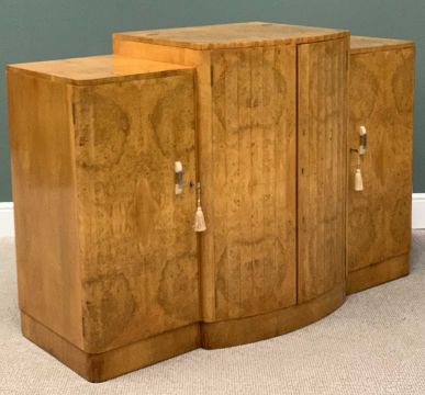 ART DECO BIRD'S EYE MAPLE VENEERED COCKTAIL CABINET SIDEBOARD, with twin fluted rib central doors and lift up top opening to reveal a mirrored and shelved interior, with slide out lower mirrored shelf and drawer, flanked by twin curved end cupboard doors on a plinth base, 104cms max. H, 153cms W, 61cms D