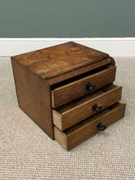 VICTORIAN OAK CELLARETTE with brass side handles, 55cms H, 40cms W, 37cms D, together with TAMBOUR EFFECT DESKTOP THREE-DRAWER CHEST & SHELF RACK, the chest 32cms H, 40cms W, 37cms D, rack, 26cms H, 69cms W, 15cms D