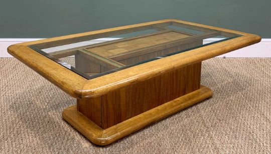 LARGE MODERN COFFEE TABLE, bevelled glass top, rectangular base, with parquet-style insert, 40h x 126w x 76cms dProvenance: private collection Cardiff