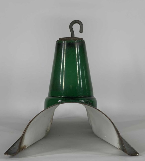 PAIR VINTAGE GREEN ENAMELLED INDUSTRIAL LAMP SHADES, c. 1920s, rectangular double light form with conical top, 29 x 53 x 27cms (2)Provenance: consigned from West Wales.Comments: lacks light fittings, chips.