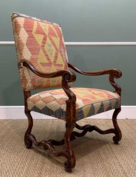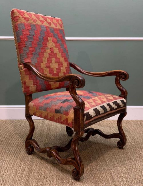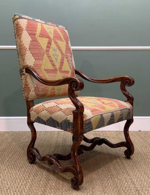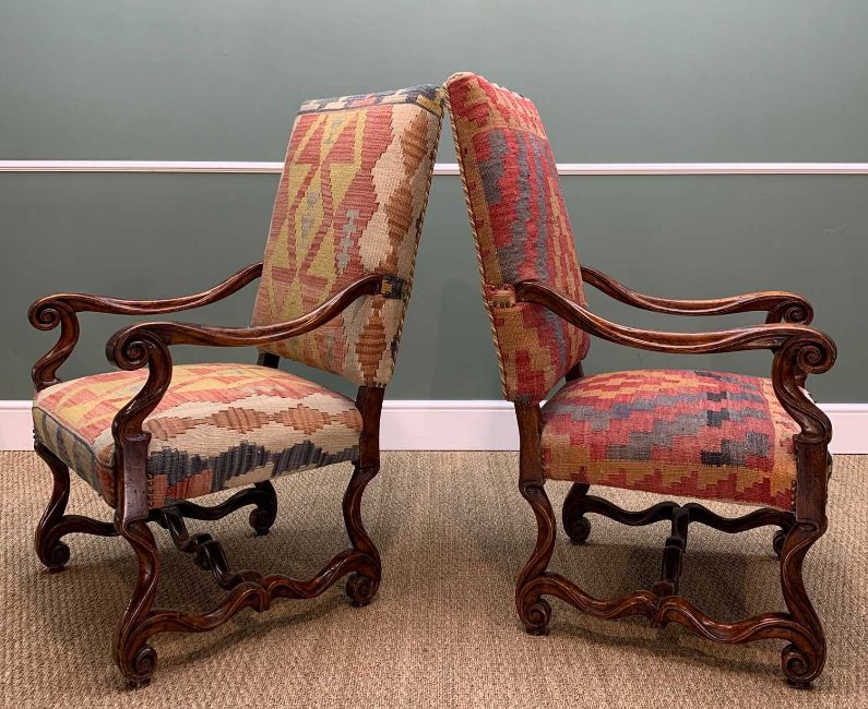 PAIR LOUIS XIV-STYLE WALNUT ARMCHAIRS, scrolled arms, legs and stretchers, kilim upholstery, 113h x 66w x 71cms d (2)Provenance: collection of the Late Dai Evans, former Director of Picton Castle and former curator of Petworth HouseComments: arms damaged/restored, inspection advised