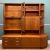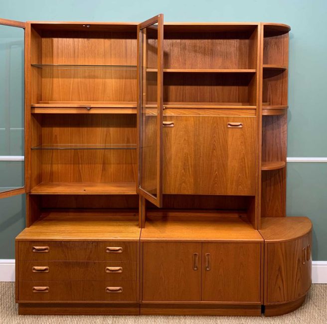 20TH CENTURY TEAK E. GOMME G-PLAN FURNITURE, comprising rounded corner cupboard with three shelves, centre fixed shelf with back lighting plus two adjustable, two door base cupboard, centre drop flap bureau with document storage and two shelves above, two door cupboard below with half depth adjustable shelf, end glass display cabinet with central fixed shelf with up lighting, with further two adjustable glass shelves, above a three long drawers, 188h x 209w x 46cms dProvenance: consigned from West WalesComments: wiring not checked or tested
